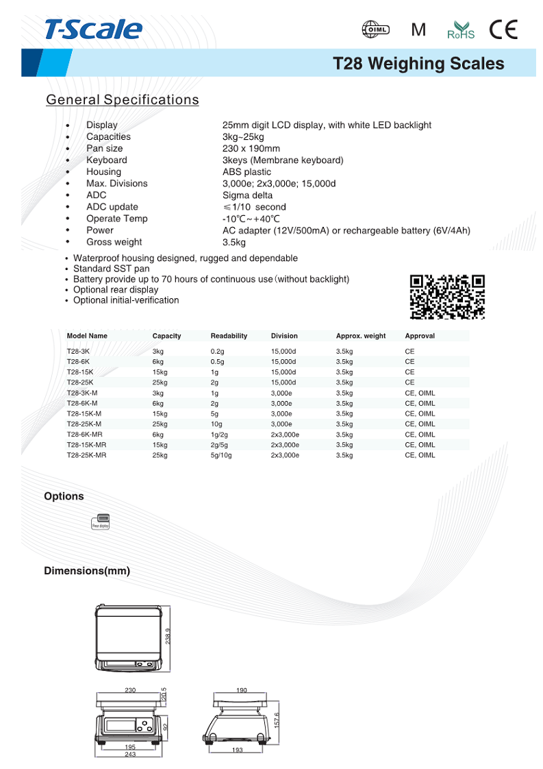Cân đơn giản - Cân điện tử T28 - cân đĩa nhỏ: giá rẻ - bền đẹp : dùng trong nhà máy , cửa hàng , nhà hàng , nhà bếp Cân điện tử T28 - cân đĩa nhỏ Gía cân từ : 1.200.000đ Cân điện tử T28 - cân đĩa nhỏ Hãng sản xuất : T-SCALES Cân điện tử T28 - cân đĩa nhỏ Màn hình : LCD 25mm , đèn LED màu trắng Cân điện tử T28 - cân đĩa nhỏ Tải trọng : 3kg đến 25kg Cân điện tử T28 - cân đĩa nhỏ Có 4 loại : 3kg - 6kg - 15kg - 25kg Cân điện tử T28 - cân đĩa nhỏ Độ sai số tương ứng :0.2g - 0.5g - 1g - 2g Cân điện tử T28 - cân đĩa nhỏ Các chương trình ứng dụng : chuyển đổi đơn vị và chức năng tự động tắt Cân điện tử T28 - cân đĩa nhỏ Pin : cung cấp tới 90 giờ sử dụng liên tục Cân điện tử T28 - cân đĩa nhỏ Kích thước bàn cân : 190mm x 230mm Cân điện tử T28 - cân đĩa nhỏ Bàn phím : 3 phím nối bàn phím màng Cân điện tử T28 - cân đĩa nhỏ Sử dụng nhựa : ABS - thân thiện với môi trường , không độc hại Cân điện tử T28 - cân đĩa nhỏ Max. Divisions : 3.000e , 2 x 3.000e : 15.000d Cân điện tử T28 - cân đĩa nhỏ ADC : Sigma delta Cân điện tử T28 - cân đĩa nhỏ Cập nhật ADC : ≤1 / 10 giây Cân điện tử T28 - cân đĩa nhỏ Hoạt động tạm thời : -10C ~ + 40C. Cân điện tử T28 - cân đĩa nhỏ Power : AC adapter (12V / 500mA) hoặc pin sạc (6V / 4Ah) Cân điện tử T28 - cân đĩa nhỏ Tổng trọng lượng : 3.5kg Liên hệ : www.ktech.com.vn SĐT : 08 - 6292 - 4220