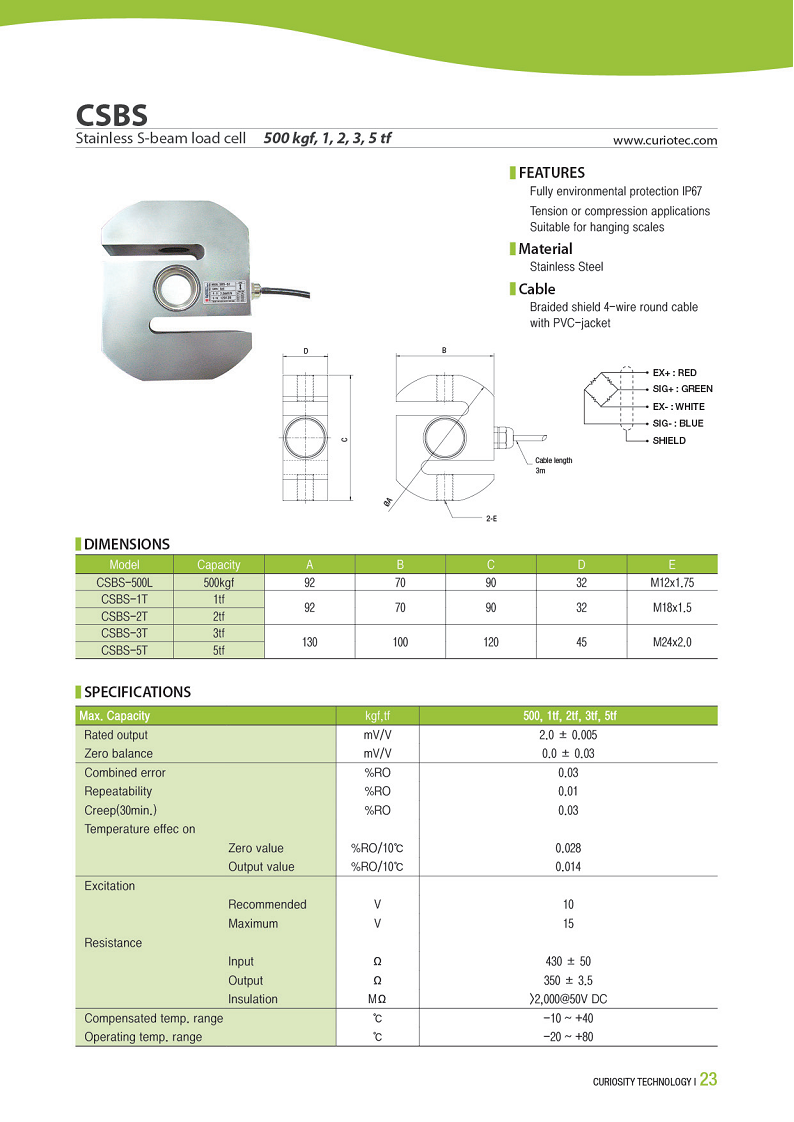 STAINLESS S-TYPE LOAD CELL 500kgf , 1 , 2 , 3 , 5tf FEATURES : - Fully environmental protection IP67 - Tension or compression application - Suitable for hanging scales MATERIAL : - Stainless Steel CABLE : - Braided shield 4 - wire round cable with PVC - jacket CONTACT : www.ktech.com.vn EMAIL : ktech102@gmail.com PHONE : 08 - 6292 - 4220